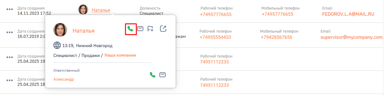 - Звонок ранее сохраненному контакту: нажмите на номер телефона контакта наведите курсор на имя контакта . При появлении карточки контакта нажмите на зеленую трубку.