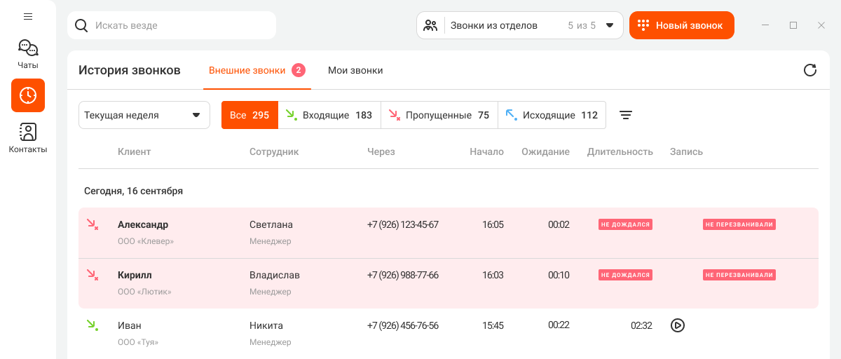 Чтобы не терять пропущенные, их число отображается в боковом меню и на вкладках в истории звонков. Здесь вы сможете узнать больше о контакте и быстро ему перезвонить. Гибкая система фильтров помогает найти любой звонок в архиве и при необходимости прослушать его запись.