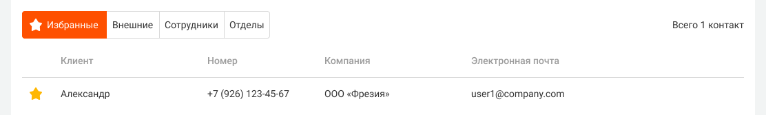 Чтобы найти нужный контакт, в поисковой строке начните писать значение одного из полей: имя, номер, e-mail контакта или название компании.