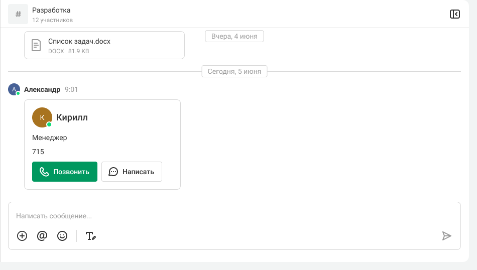 • Поделиться контактом в чате — в чате отобразится краткая карточка контакта с кнопками вызова и отправки сообщения (если это внутренний контакт).
