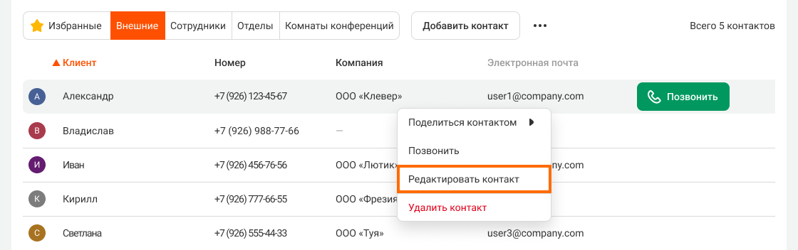 В списке контактов нажмите правую кнопку мыши, выберите «Редактировать контакт» или «Удалить контакт».