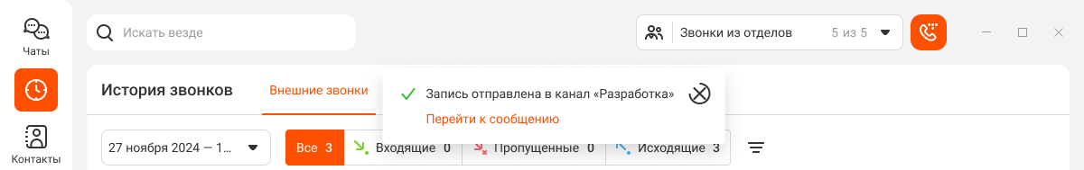 Появится окно с уведомлением об отправке записи. Из него вы можете перейти в чат, куда отправлена запись.