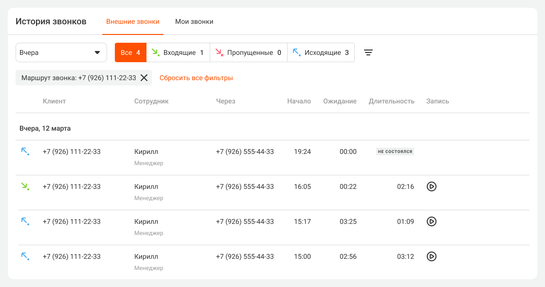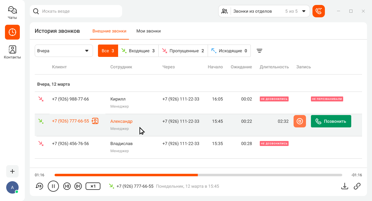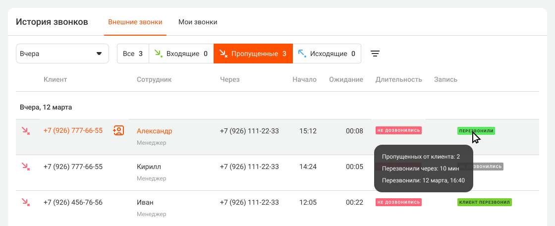 Благодаря фильтру «Контроль пропущенных» вы сможете легко найти непринятые звонки, на которые сотрудники не перезванивали или не дозвонились.