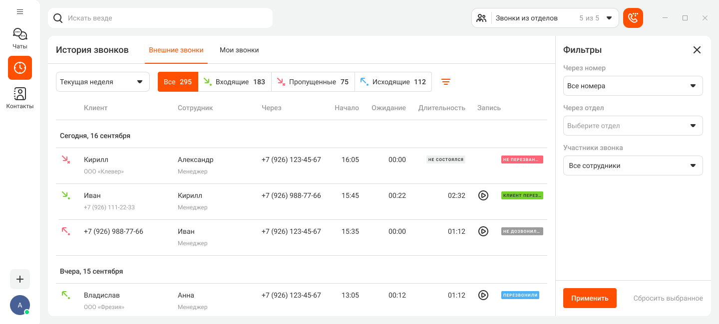 - фильтровать звонки по номерам, отделам, сотрудникам, клиентам и типам вызовов за нужный период;