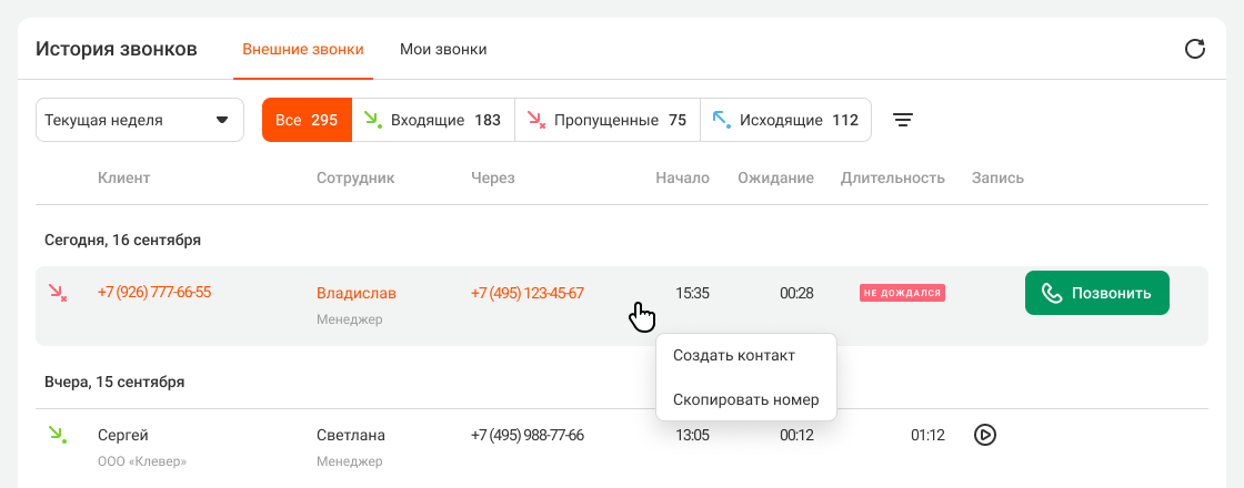 Чтобы перезвонить по пропущенному, наведите курсор на соответствующую строку и нажмите на кнопку «Позвонить» справа.