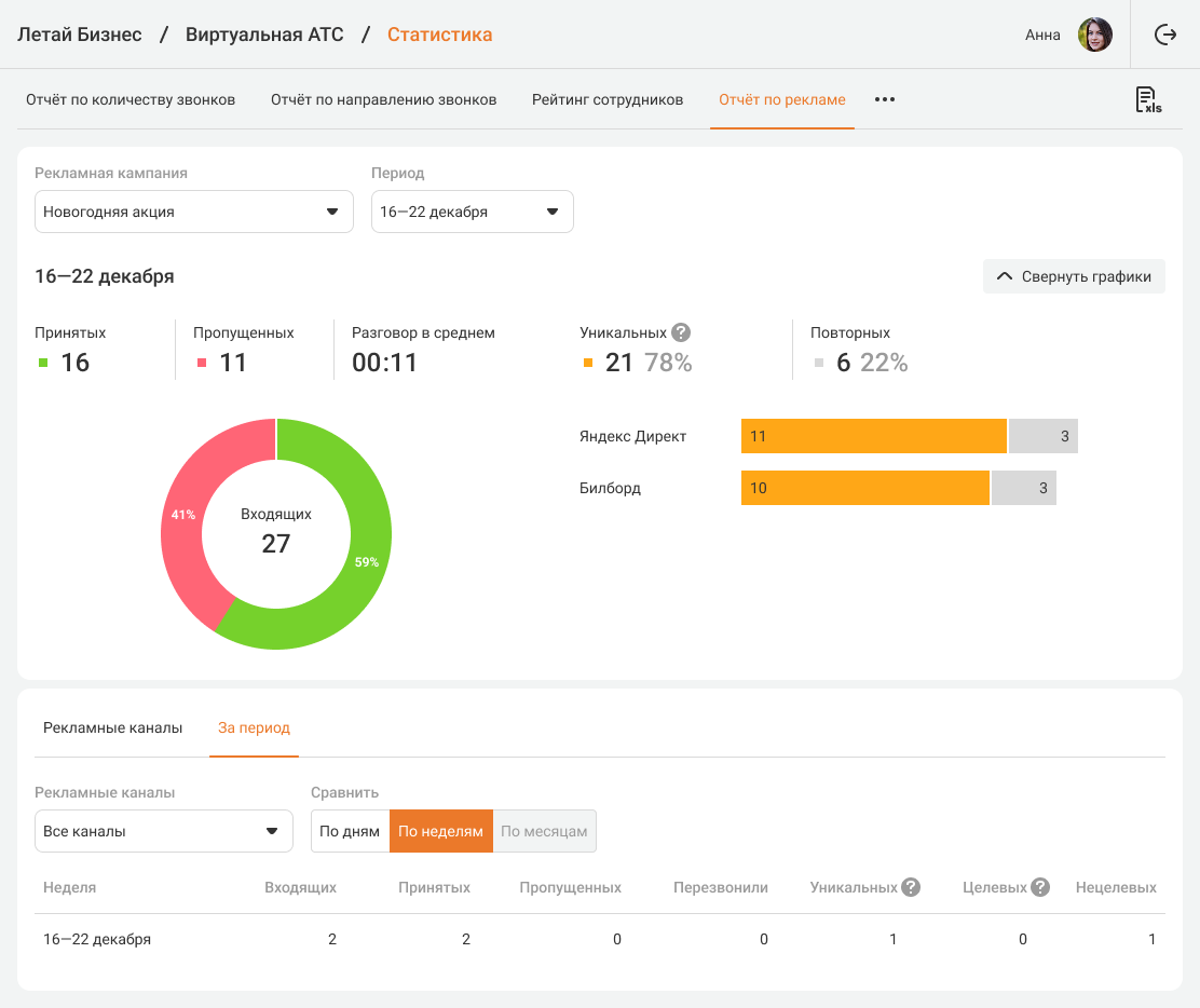 По количеству уникальных входящих звонков, поступающих с каждого рекламного канала, вы определите, для какого канала стоит увеличить бюджет, а от какого — отказаться. Также рекомендуем прослушивать входящие звонки на каждый из номеров, чтобы оценить не только количество, но и качество заявок в зависимости от источника трафика.