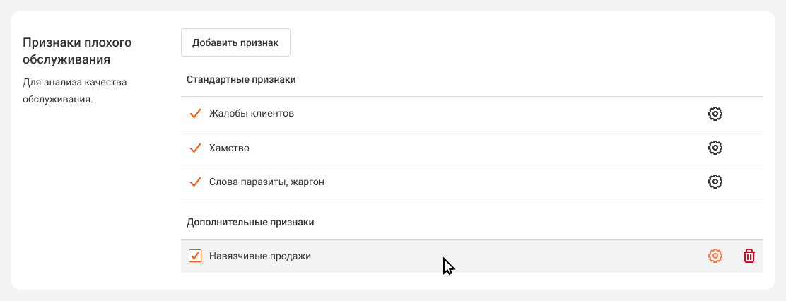 Например, добавить ключевую фразу: «позовите руководителя» или «буду обращаться в суд». Для этого нажмите на шестёренку рядом с готовым признаком и введите слова через запятую.